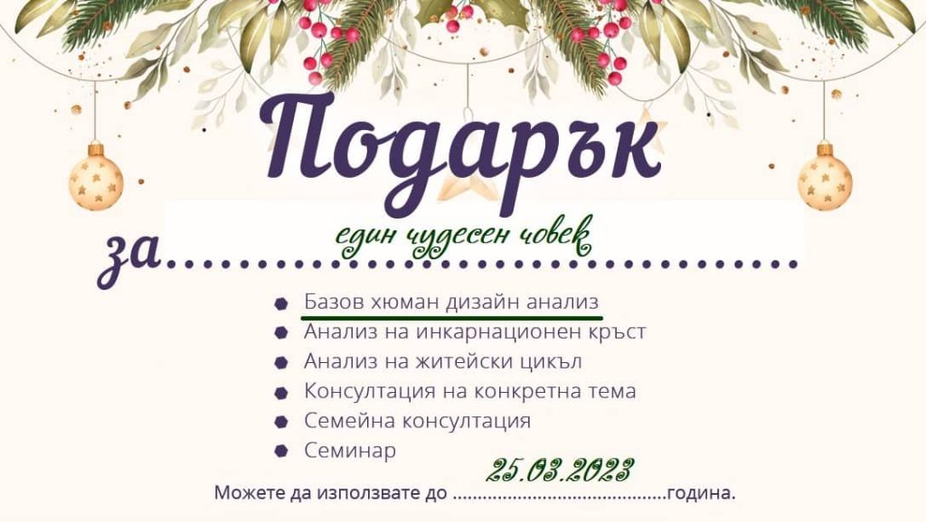 За Коледа подари познание! Базовият Хюман дизайн анализ е холистичен анализ, който дава пълна представа за твоя тип, стратегия, вътрешен авторитет, вродени дарби, както и потенциалните капани, в които може да те въвлече твоят ум.