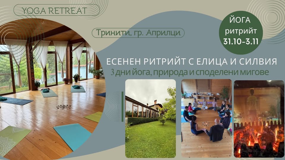 С настъпването на златната есен имаш възможността да се включиш в едно специално пътешествие навътре – към тишината, покоя и същността си с 3-дневен есенен ритрийт в град Априлци. Заедно с Елица Хорозова и Силвия Иванова ще се посветиш на йога, осъзнатост и природна хармония в Тринити Ритрийт Център, сгушен в сърцето на Балкана.